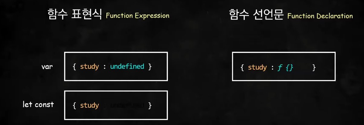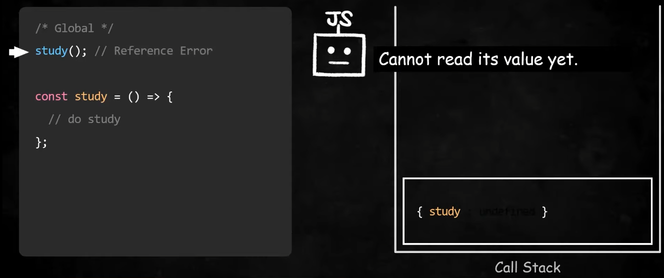 var키워드에 화살표 함수를 담아 선언문 이전에 실행하려고 하면 환경레코드에 기록되어 있는 study의 값은 undefined이고 undefined라는 데이터타입은 함수와 달리 호출될 수 없기 때문에 TypeError가 발생하는 것이다!!(즉, undefined( ) 꼴이 되는 것이므로 호출할 수 없는 것임)위와 모든 조건이 같고 var만 const로 바꾼다면 환경 레코드에 변수는 선언되었지만 그에 할당된 값이존재하지 않아(값을 위한 메모리공간 존재하지 않음)Reference Error가 발생하는 것임. 이와 같이 함수 표현식은 변수 호이스팅과 동일하게 동작한다(쉽게 생각해서 함수를 변수에 담고 있으므로 벼수 호이스팅과 동일하게 동작한다고 보면된다)