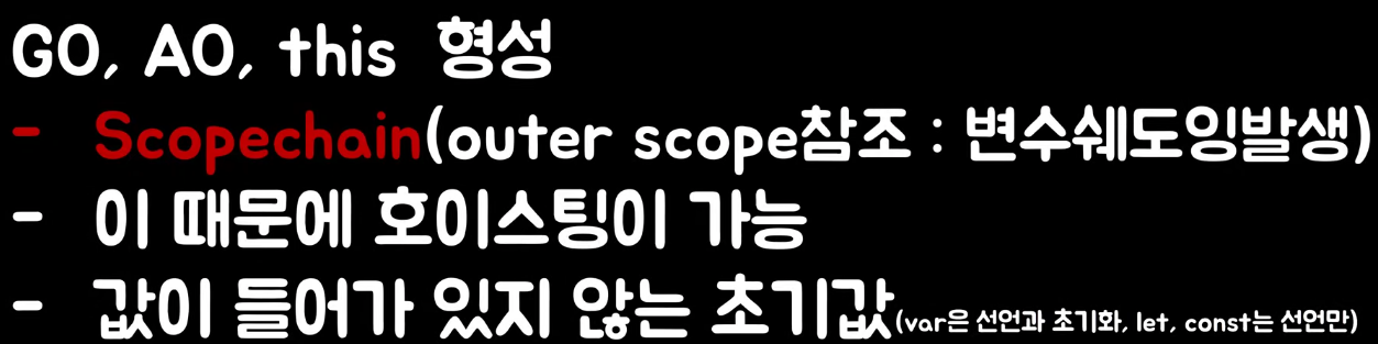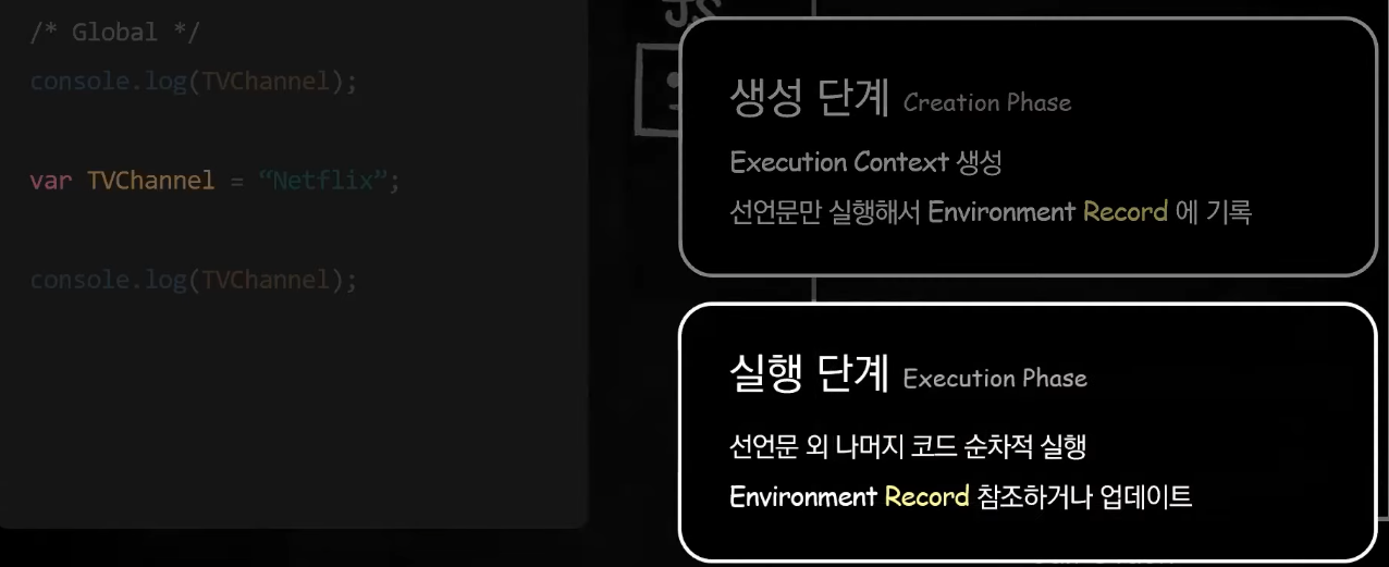 스캔하고 생성(실행 컨텍스트 생성, 선언문만 실행,환경레코드에 undefined라는 값으로 저장)하는 단계를 생성단계라고한다. 이후 선언문 외의 나머지 코드를 순차적으로 실행하는데 이 단계를 실행 단계라고 함. 연속적슬라이드를 보고 싶다면 https://www.youtube.com/watch?v=EWfujNzSUmw