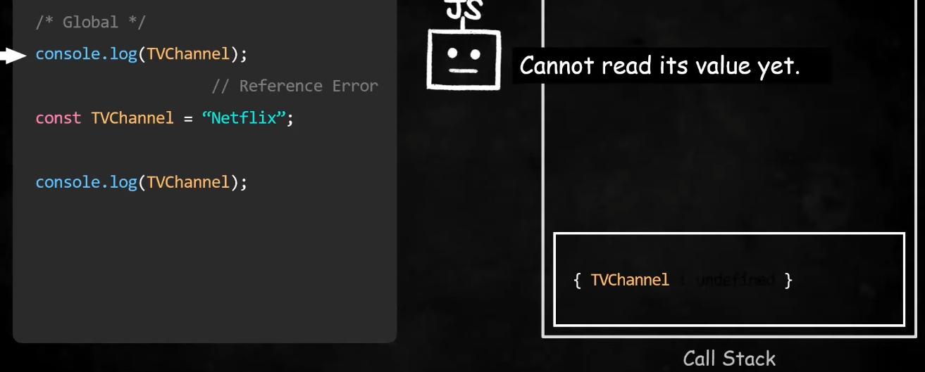 var과는 다르게 const, let같은 경우 선언문 이전에 변수의 값을 읽어들이려 하면 Reference Error가 발생함(Type Error가 발생하는 것이 아님). 이유는 실행컨텍스트안의 환경 레코드에 TVChannel이라는 변수를 저장은 해두었지만 값을 초기화하진 않아서, 값 저장을 위한 메모리 공간은 마련해 두지 않아서 그런것임.