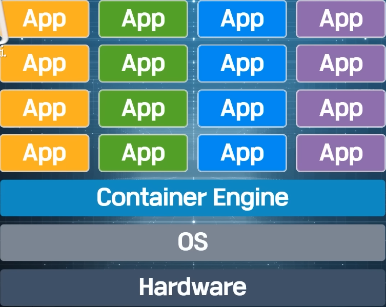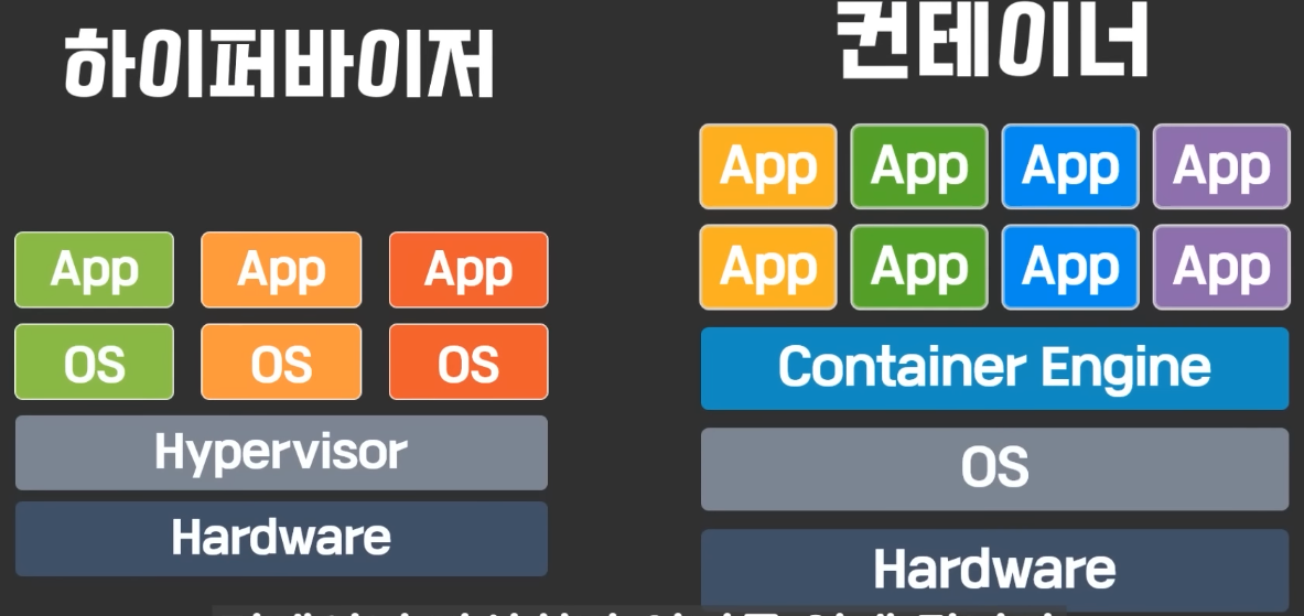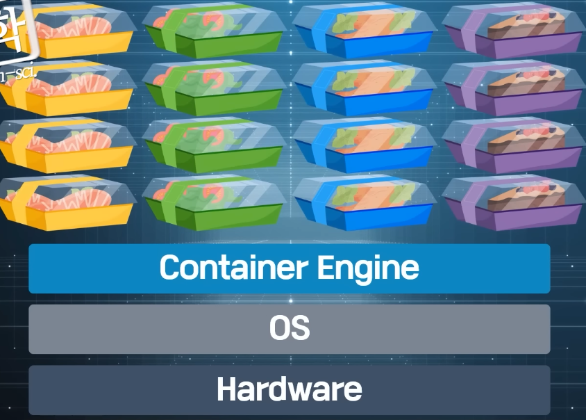 컨테이너 가상화 기술은 각각의 컴퓨팅 환경을 모듈화하여 격리함. 이 모듈화된 것들 각각이 하나의 컨테이너임. 즉, 하이퍼바이저 없이각각의 App을 밀키트(컨테이너)처럼 포장해두고 조리하는 주방을 분리하는 것임(이 주방이 OS임. 즉 각각의 APP(밀키트, 컨테이너)에 걸맞는 주방(OS)을 APP에 맞춰가면서 변경하는 것임. 내생각에 특정앱에 걸맞는 특정주방(OS)을 변경, 선택해 주는 역할을 Container Engine이 하는 것임)