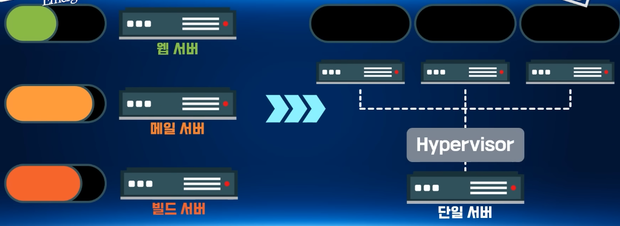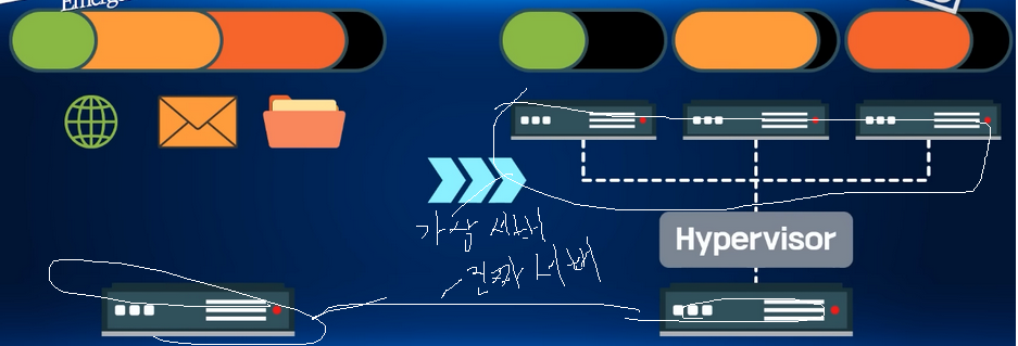 하이퍼바이저: 컴퓨팅 가상화를 가능하게 SW가상화 플랫폼. 하나의 컴퓨터(Hardware)와 그 안의 여러 운영시스템(OS)들 간의 소통을 돕는 역할.