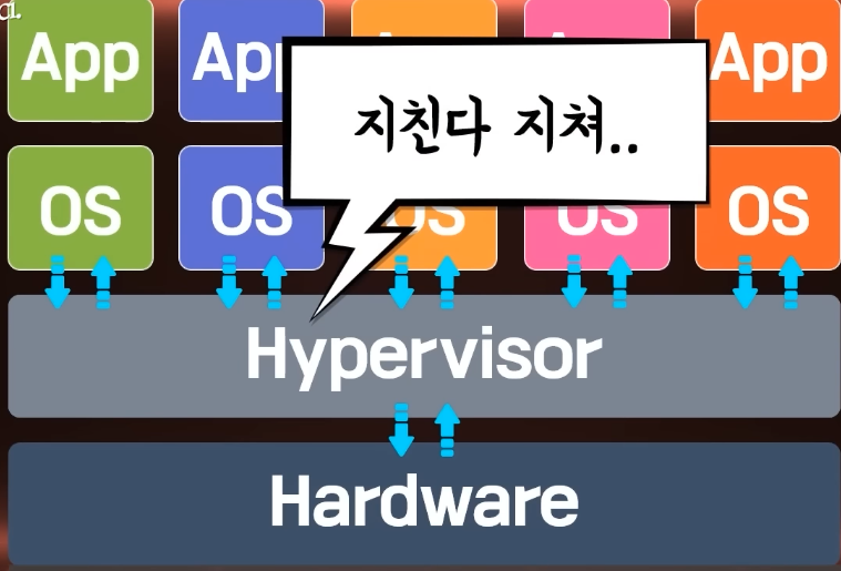 하지만 위와같은 Hypervisor도 완전한 기술은 아니었음. Hypervisor가 모든 명령들을 컨트롤하고 가상환경을 구축하다보니 여러 os를 구동하기 벅참.==>> 성능 문제로 이어지게 됨.