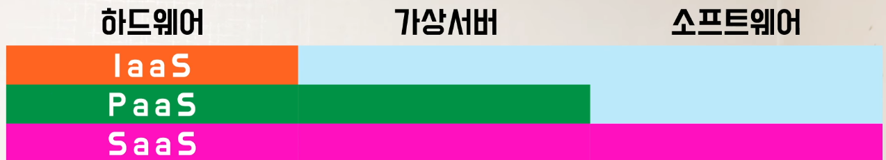 IAAS는 기본적인 인프라 스트럭처(Infra structure)인 서버, 네트워크, 스토리지만을 빌려쓰는 것이다. PASS는 이에 더해서 추가적으로 운영체제와 미들웨어까지 더 빌리는 것이고 SAAS는 이 모든것에 더해서 소프트웨어까지 빌리는 것이다.