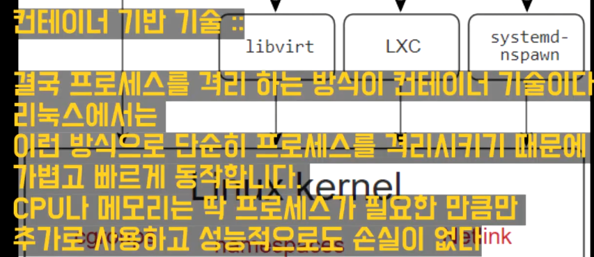 프로세스를 격리시키는 기술이 컨테이너의 핵심기술임. 즉, 각각의 컨테이너에 들어가는 응용 프로그램이 어떤 운영체제에 의존적으로 동작하는지, 그 의존성을 없애 버리는 것임. 이렇게 함으로써 기존의 Virtual Machine과 같이 응용프로그램마다 가지고 있는 각각의 Guest OS를 별도로 Hypervisor위에 각각 설치할 필요가 없어진 것임. 다시 말해서 프로세스 격리 기술이 컨테이너 기술의 핵심임. 즉 프로세스를 운영체제에 의존적이 아닌 독립적으로 굴러가게 만드는 기술이 컨테이너의 핵심기술임( 빨간 글씨체=내정리)