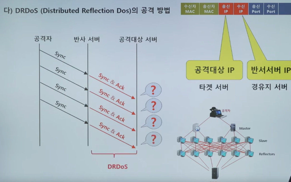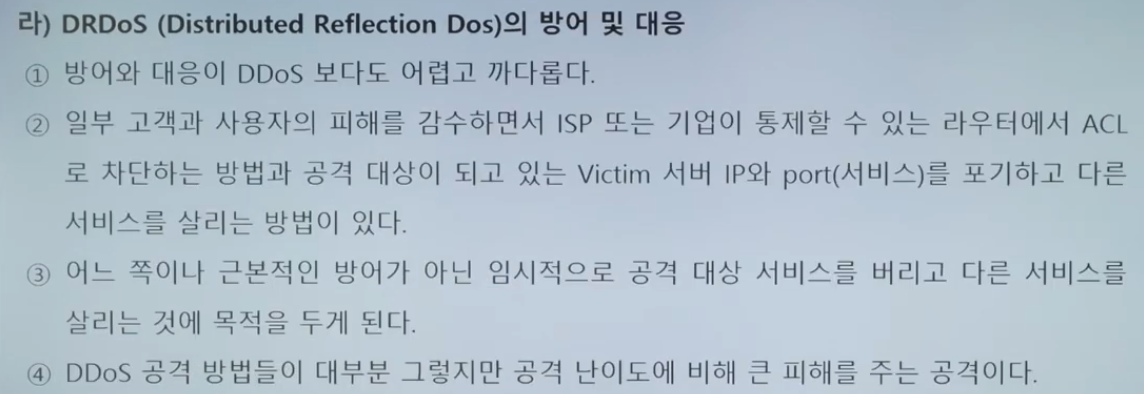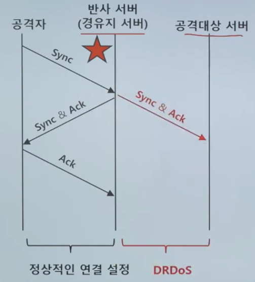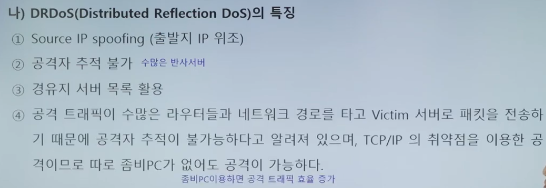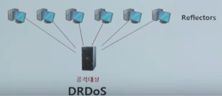 DRDOS(Distributed Reflection Dos:분산 반사 서비스거부 공격): DRDos는 DDos가 한 단계 더 진화한 형태의 공격 방식이다. 별도의 에이전트 설치 없이 네트워크 통신 프로토콜 구조의 취약성(3 hand-shaking을 말함)을 이용해 정상적인 서비스를 운영하고 있는 시스템을 DDos공격의 에이전트로 활용한다.