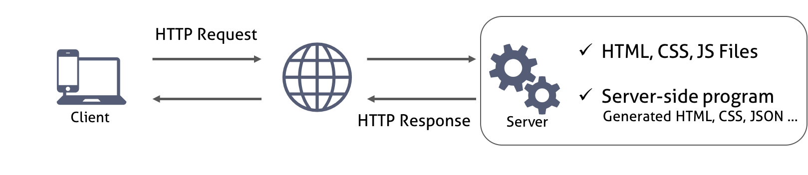 서버는 요청받은 페이지(HTML)를 반환하는데 이때 HTML에서 로드하는 CSS나 JavaScript 파일들도 같이 반환된다. 클라이언트의 요청에 따라 서버는 정적인 파일을 반환할 수도 있고 서버 사이드 프로그램이 만들어낸 파일이나 데이터를 반환할 수도 있다. 서버로부터 웹페이지가 반환되면 클라이언트(브라우저)는 이를 렌더링하여 화면에 표시한다.