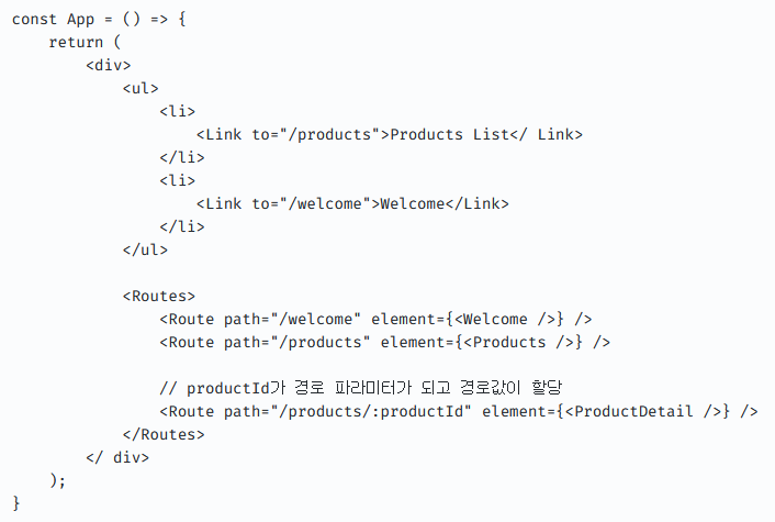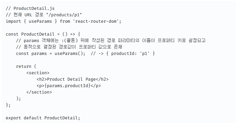 찾다보니 <Route path="/products/:productId" element={<ProductDetail />} /> 이러한 productid라는 경로 파라미터(동적 경로 매개변수)를 가진 Route를 찾아내게 되고 바로 여기에 동적으로 결정된 /products/p1라는 URL의 경로값이 useParams를 통해 할당되게 되는 것이다. 즉, 경로 파라미터, 더 정확히는 : 기호는 바로 구체적인 경로값이 할당되어 지기를 기다리는 경로 파라미터, 다른 말로는 동적으로 결정되어지기를 기다리 동적인 경로 매개변수인(동적 경로 파라미터)것이다.