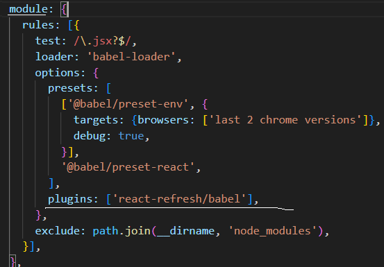 5. 이 부분이 복잡한데, module안의 plugins부분에 아래 그림과 같이 'react-refresh/babel' 을 넣어준다.