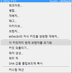 여기서 추가적으로 한가지 더 중요한 배울거리는 "이 커밋까지 현재 브랜치를 초기화"를 선택하면 아래와 같은 선택지창이 나오는 것을 볼수 있는데 여기서 hard를 선택하면 내가 마지막으로 코딩하여 커밋했던 그 파일의 내용이 그 이전으로 싹다 변경된다는 것이다.