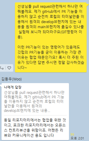 방법1. 가장 권장되는 방법으로 github을 이용, github의 PR(pull request)를 이용하는 것이다. 우선 변경된 내용을 add, commit, 원격의 develop브랜치에 push한수 아래 보이는 pull request버튼을 눌러 차례차례진행시켜 준다. 이렇게 되면 말그대로 협업이 가능하게 되는 것이다. 왜냐하면 내가 pr요청을 한것을 누군가가 검사하고 적절하면 반영한다는 의미이므로.