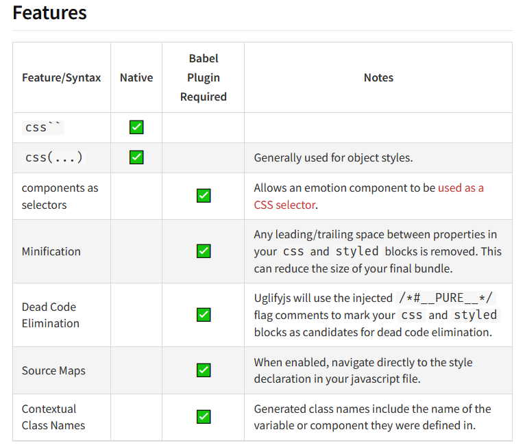 중요한 것은 나는 위의 표가 @emotion/babel-plugin 를 설치하면 얻을 수 있는 특징이라고 해석하지도 못했다는 것에 있다. 하지만 이건 걱정하지 않아도 된다. 익숙히 해 나가면 되는 거니까. 정말 중요한 것은