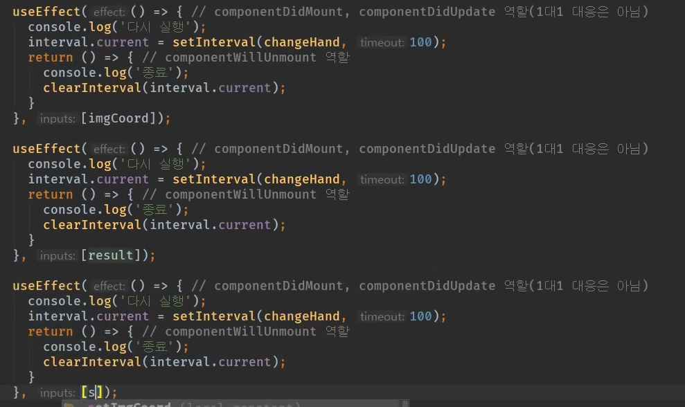 복습! 함수형 컴포넌트에서 아래에서 내가 정의한 setResult, setImgCorrd...와 같은 함수로 state를 변화시키면 컴포넌트 전체가 리랜더링됨(함수도 재정의 된다는 말)