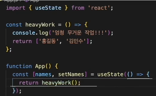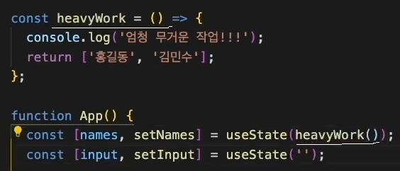 있다!!! 초기값을 넣는 인자 자리에 바로 함수 heavyWork를 넣지 않고 화살표 함수로 아래와 같이 callBack형식을 만들어 주면 된다!!!