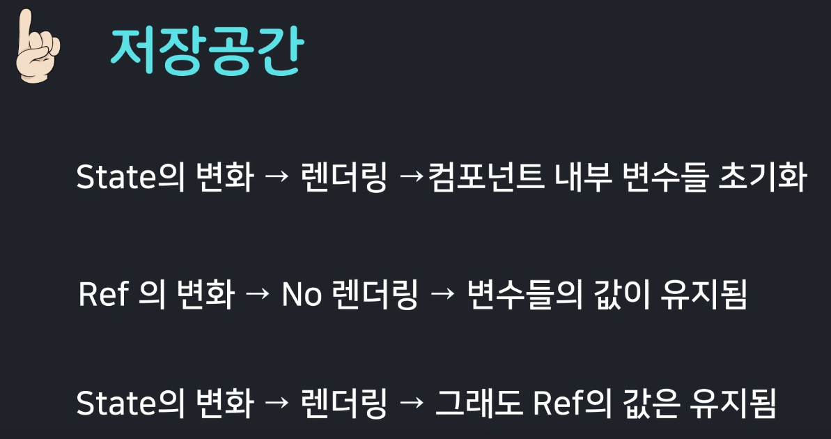 ✅ ref는 렌더링이후에도 값이 유지되지만, 변수는 초기화된다.