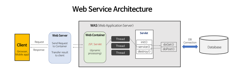 클라이언트의 요청(Request)을 WAS에 보내고, WAS가 처리한 결과를 클라이언트에게 전달(응답, Response)한다.(내가 정리한 다른글 https://it-eldorado.tistory.com/85 을 보면 이 말이 아니라고 생각할 수 있는데, 이 말이 맞다. 결국은 WAS에서 받은 소스파일이 있어야 동적인 컨텐츠를 WAS에 요청하고 응답을 페이지에 반영하므로 결국은 WAS로 부터 받은 페이지에서 요청을 보내고 그 결과가 반영되는 것이다)