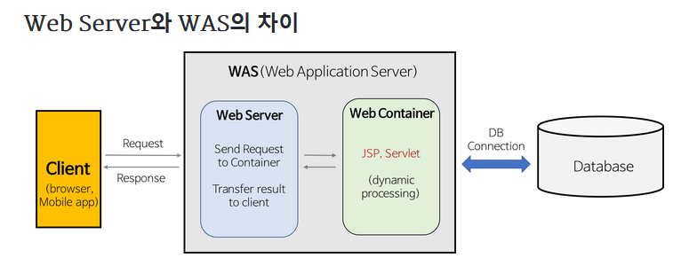 즉, WAS는 JSP, Servlet 구동 환경을 제공한다.