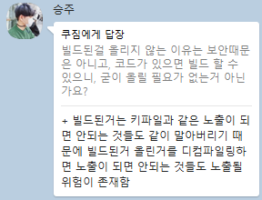 이 질문을 해결하기 위해 단톡방에 물었다. 답은 여럿이었고 공통된 답으로 받은 내용은 이 통째로 보관된 결과물을 Git에 올리게 된다면 변경사항을 업로드하거나 내려받을 때 시간이 오래 걸릴거고, 작업 폴더 안 .git 폴더의 용량도 크게 늘게 될 것이라는 것이다. 다른 이유로는 보안상의 이유, 난독화된 것을 무엇하러 올리나? 등이 있다. 무엇보다 GPT에게 물어보니 정확한 답변을 얻을 수 있었다.