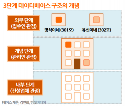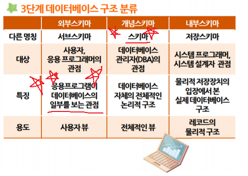 첫번째가 스키마에 대한 개념인데 스키마로는 총 외부, 개념, 내부 스키마가존재한다(데베설 p27).
