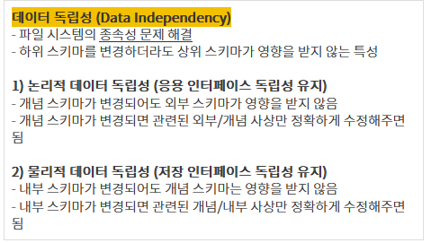 개념 스키마에 새로운 개체나 속성의 추가와 같은 변화가 발생해도 외부/개념 사상만 수정해 주면 외부스키마(응용프로그램이 데이터베이스 일부를 보는 관점)에 아무런 영향을 주지 않고도 개념 스키마를 변경할 수 있으므로 데이터 독립성이 제공되는 것이다!!!