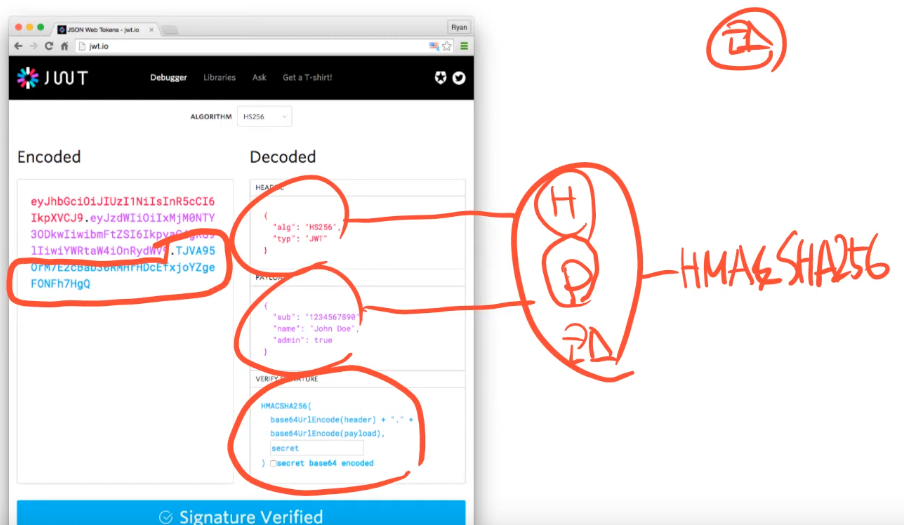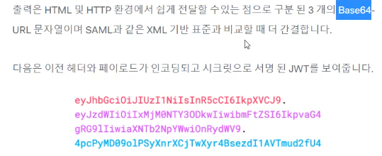 위와 같은 2가지 방식(HS256, RSA)중 보편적으로 사용되는 것은 HS256입니다. HS256방식에서 header와 signature부분을 HS256(암호화 방식으로써 HMAC과 SHA256의 합성어. 그냥 몽땅 암호화 방식이라고 기억하면 됨)방식으로 암호화 한 후에 header, payload, signature각각을 Base64로 인코딩함.