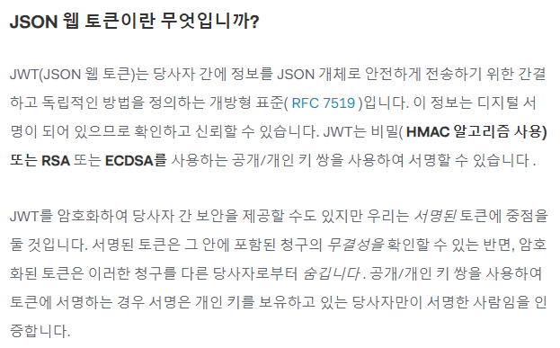 JWT(Jason Web Token)란? 클레임이라고 불리는 정보를 JSON형태로 안전하게 전송하기 위한 토큰 기반의 표준. 인증과 정보교환에 사용됨. 서명이 되어 있어서 신뢰성을 확보할 수 있다.