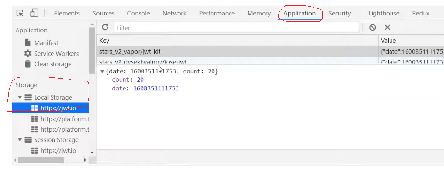 클라이언트측에서 처음로그인시 인증정보를 제공하면 서버에서는 Header, Payload, Signature로 구성된 JWT을 만들어 클라이언트에 전송해 준다. 브라우저 측에서는 이를 아래와 같은 로컬 스토리지(Local Storage)영역에 저장해 둔다.