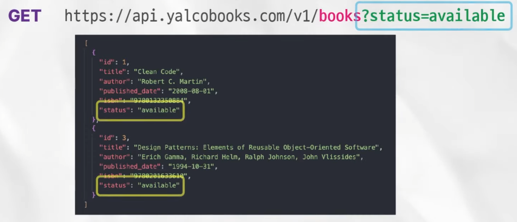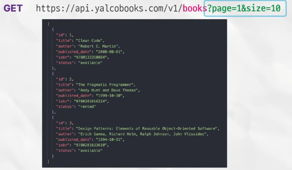 필터링할 조건이 없는 상태에서도 단순히 https://api.yalcobooks.com/v1/books라고 요청을 보내면 모든 책들의 정보가 오기 때문에 아래와 같이 쿼리 파라미터를 붙여준다. 한 페이지에 10권씩 도서정보를 담고 1페이지에 있는 책들의 정보를 보내달라는 의미이다.