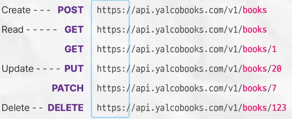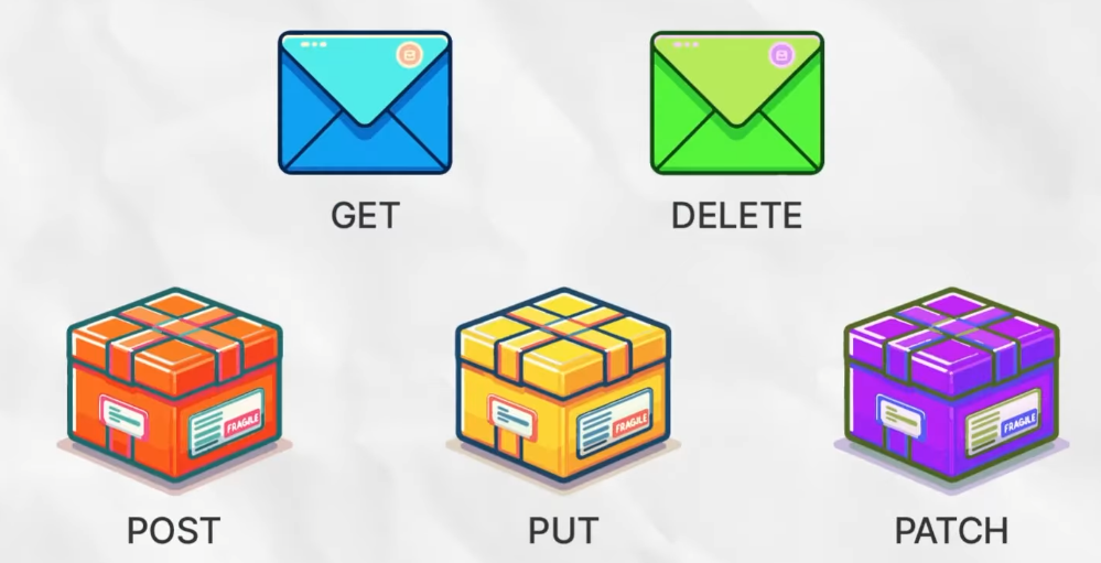 HTTP프로토콜 중에서 REST API설계에 주로 사용되는 HTTP메서드는 총5가지다. GET, POST, PUT, PATCH, DELETE. HTTP프로토콜을 우편서비스라고 비유하고 각각의 메서드를 우편물의 종류라고 비유한다면 GET, DELETE는 편지지이고 POST, PUT, PATCH는 소포이다. 와... 정말 비유 끝내준다. 즉 HTTP의 message body에 주로 내용이 올수 있는가 없는가에 따라 편지지인지 소포인지로 나눈 것이다(물론 GET메서드도 message body안에 내용물을 넣을 수 있지만 널리 사용되지는 않는다)