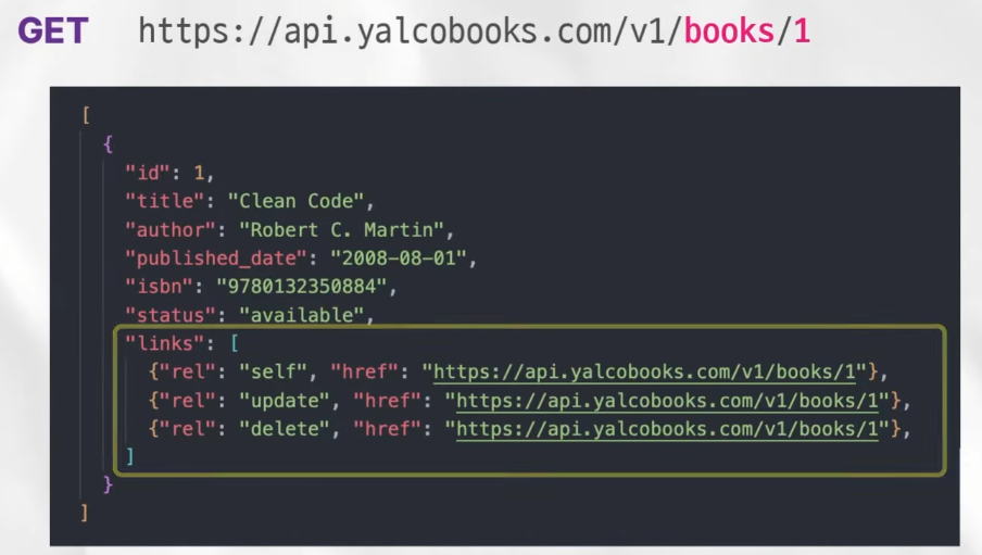 RESTful API설계 원칙에서 권장되는 또다른 설계 원칙은 HATEOAS 이다. 아래와 같이 각 요청의 응답에 가용한 다른 요청들의 정보를 포함시키는 것이다. 'URL에 표시된 리소스에 관해(links) 이러이러한 기능들도 이와 같이 요청할 수 있다' 라고 첨부해 주는 것이다!!