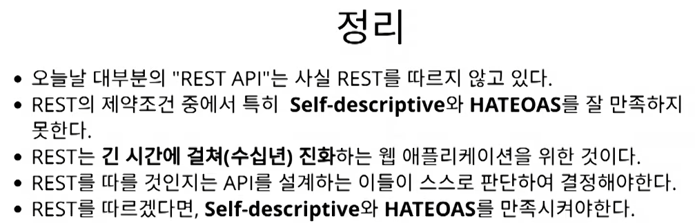 REST API의 이러한 설계원칙이 HTTP를 이용하여 잘 지켜져서 만들어졌기 때문에 개발자가 다른 팀과 협업하거나 어떤 public API를 처음으로 사용해야 하는 상황에서도 어려움 없이 새 API의 사용법을 익힐 수 있는 것이다.