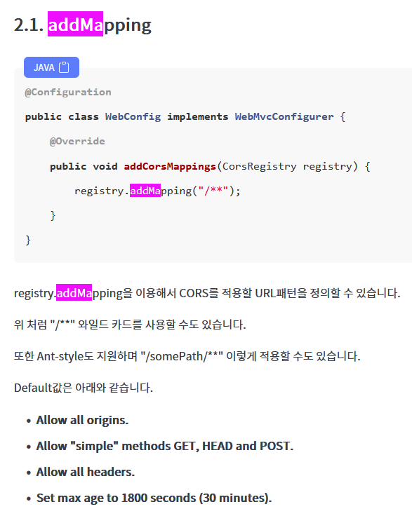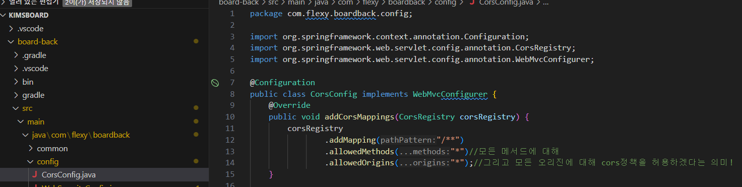 에 있는 cors를 CorsConfig.java에 작성해 주면 된다. 스프링부트에서 CORS를 어떻게 설정하는가는 아래글에 자세히 나와있다.