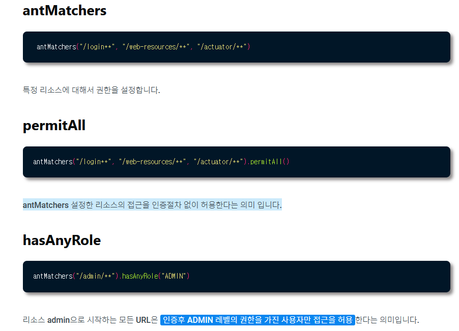 도움: https://kimchanjung.github.io/programming/2020/07/02/spring-security-02 ==> Spring Security에 대한 유용한 짧은 글(Security와 관련된 각종 중요 메서드와 커스텀 필터를 등록하는 방법 설명).