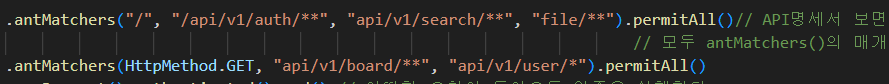 내가 만들어 놓은 API명세서를 보면서 별도로 인증이 필요하지 않은 URL요청을 모두 antMatchers()의 매개변수에 넣어준다. 우선 Auth와 관련된 API요청에서는 인증이 따로 필요하지 않다. Auth를 해야하는 페이지이기 때문에 그런것 같음ㅋㅋ