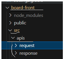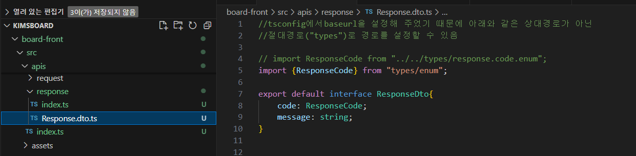 Front측에서도 서버와의 데이터 통신을 위해 Response.dto를 만들어 주었다. 여기서 파일 구조의 특징중 하나 알고 넘어가야 할 것이 파일이름이 index라고 하면 index파일에서 export 한 클래스가 다른 곳에서 쓰일 수 있다는 것이다. 기억해야 할것은 반드시 파일이름이 index인 곳에서 export해야 한다는 것이다. 아래는 type파일의 enum파일안의 index.ts파일에서 export한 ResponseCode를 import한 코드이다.