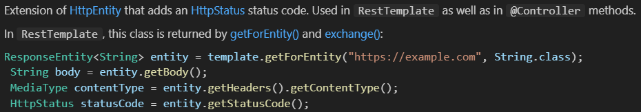 요약: ResponseEntity란 Httpentity를 상속받는 클래스로써 결과 데이터와 HTTP상태코드를 직접 제어할 수 있는 클래스이다. ResponseEntity에는 사용자의 HttpRequest에 대한 응답 데이터가 포함된다. 또한 HTTP아키텍쳐 형태에 맞게 Response를 보내주는 것에도 의미가 있다. 에러 코드와 같은 HTTP상태 코드를 전송하고 싶은 데이터, 헤더값과 함께 전송할 수 있기 때문에 좀 더 세밀한 제어가 필요한 경우 사용됨. 즉 정리하자면 RestAPI를 사용하면서 ResponseEntity를 통해 HTTP프로토콜 형식을 만족하여 클라이언트로 부터온 Request에 맞게 Response를 보내 주는 것이 ResponseEntity클래스이다.