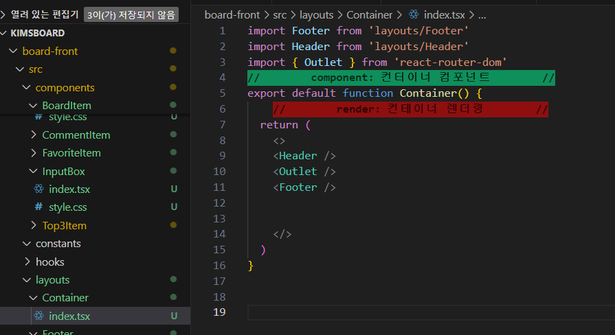 다시 layouts폴더 안의 Container폴더안의 index파일안에 가서 아래처럼 모형을 갖추어 준다.