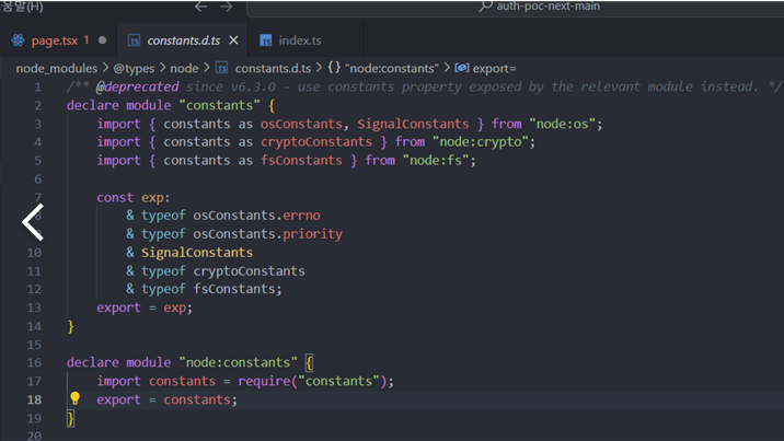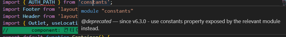 중간에 파일명을 constants로 해서 문제가 생겼다. 왜 constants로 하면 안되나? 대화방에 질문한 끝에 오류의 원인을 보편적으로 해결할 수 있는 방법을 찾았다. 컨트롤 누르고 문제의 constants에 마우스를 올리면 아래와 같은 오류문구가 뜬다.