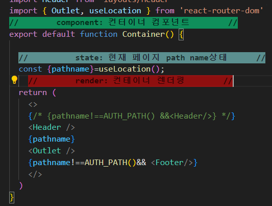 코드를 보면 알겠지만 auth화면이 아닐 경우에만 Footer컴포넌트가 사용되게 끔 꾀를 부린것을 볼수 있다.