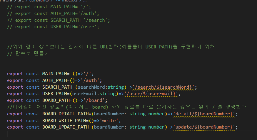 아래 그림을 보면(App.tsx) path에 대한 이름을 모두 리터럴 값으로 지정해 놓았는데 리터럴 path값은 개발할 때 많이 쓰이게 됩니다. 따라서 오타를 내기 쉬운데 그것을 방지하기 위해 상수값으로 아예 지정해 버리는 것입니다. constants폴더에 index.ts파일을 만들어 줍니다.
