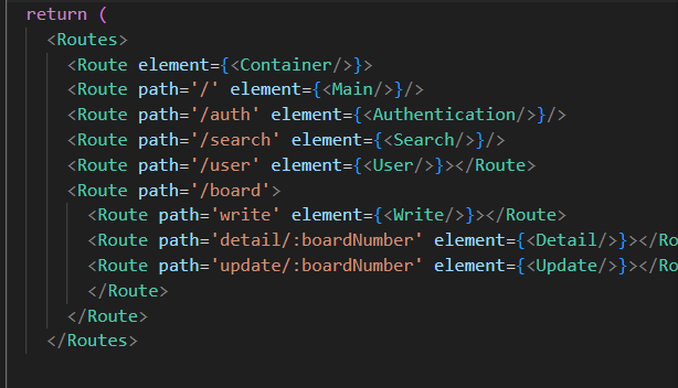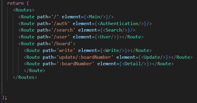 여기서 주의 할 것이 만약 경로를 http://localhost:3000/board/update 와 같이 작성해 주면 어디로 갈까? 업데이트 화면으로 가지 않는다 Detail로 간다. path='update/:boardNumber' 로 갈려면 어찌됐든 간에 update다음에 어떠한 아무 것이라도 와야 한다. 그냥 update만 오면 그것은 :boardNumber와 매칭된다.