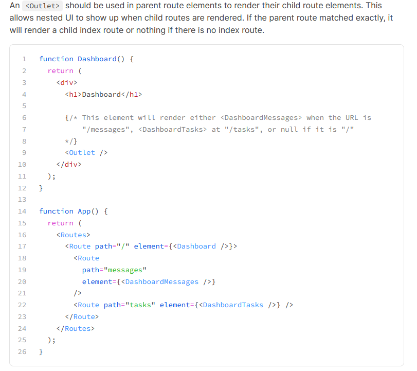 Outlet은 부모 컴포넌트에 쓰여 자식을 랜더링 해주기 위해서 사용한다. 즉 자식 컴포너트를 보여줄지를 결정하는 것이다.