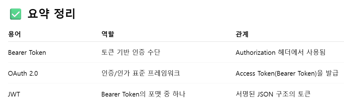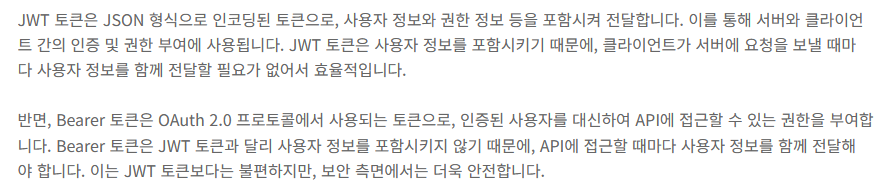 Bearer토큰은 OAuth 2.0프로토콜에서 사용되는 토큰이다. 따라서 인증된 사용자를 대신하여 API에 접근할 수 있는 권한을 부여한다. Bearer토큰은 JWT토큰과 달리 사용자 정보를 포함하지 않기 때문에 API에 접근할 때마다 사용자 정보를 함께 전달해야 한다. 이는 JWT토큰보다는 불편하지만 보안 측면에서는 더욱 안전하다.
