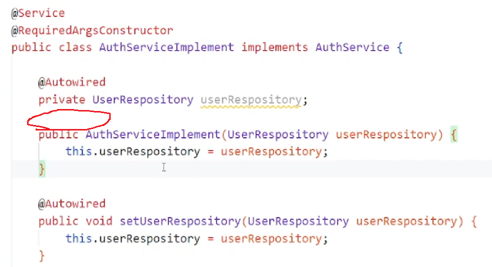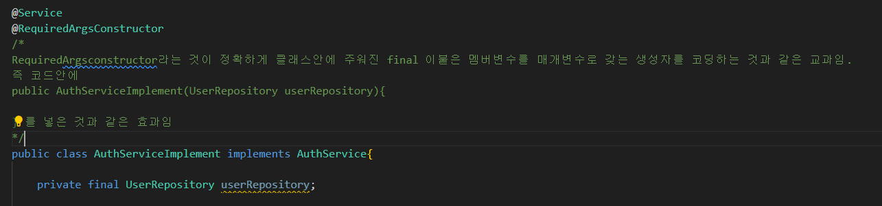 여기서 더 간편함을 추구하여 lombok의 @RequiredArgsConstructor을 사용하면 생성자를 따로 정의해 주지 않아도 된다. 단 변수를 반드시 final로 지정해야함. 즉 아래와 같은 코드로 userRepository는 의존성을 저절로 주입받게 되는 것이다.