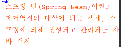 스프링 빈(Bean)이란 객체다. 스프링에 의해 생성되고 관리되는 자바 객체이다. 제어역전의 대상이 되는 객체이다.