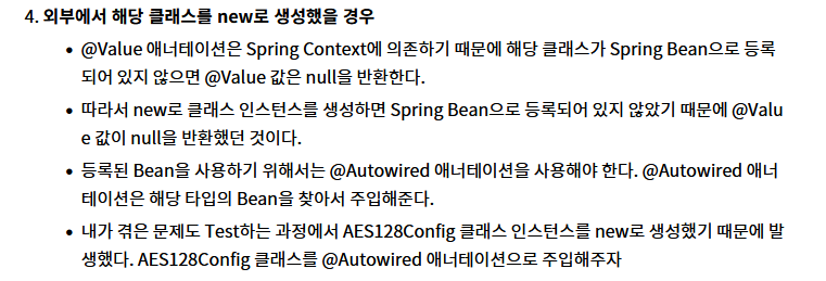 Kimsboard 프로젝트 중에 위와 같은 에러가 발생하였다. 문제의 원인은 깃헙에 올릴때 보안을 위해 각종 비밀키를 applilcation.properties파일에 보관을 하는데, 이 파일에 보관된 값을 @Value 어노테이션을 사용하여 필요한 곳에 불러오게 되는데 불러온 값이 null이 되어 있다는 것이다. 아래의 글로부터 많은 도움을 받았다.