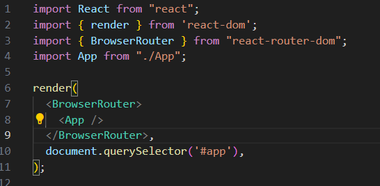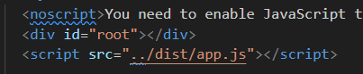 이 코드에서 대상이 될 만한것이 뭐가 있을까? 인자로 들어간 #app 밖에는 없다. 그럼 #app이라는 컨테이너는 DOM구성요소가 아니라는 말인데... 그렇다 app이라는 이름을 id로 설정한 <div>태그는 없었다. 내가 실수한 것이다. #app을 #root로 바꾸어 줘야 한다. 왜냐하면 #root는 index.html파일에 내가 코딩한