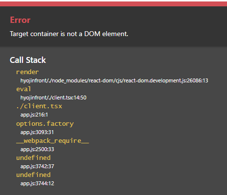 오류만 놓고 보면 정확히 " 대상 컨테이너가 DOM 요소가 아닙니다. " 라는 말이다. 대상이라니 이 무슨 얼토당토 않은 말인가? 대상이라고 하면 내가 지정해준 무언가이다. 그래서 오류코드로 보았을때 명확히 첫번째 줄에 나오지 않는것이다. 스텍 구조에 익숙하다고 생각되는 나는 오류의 첫번째 줄이