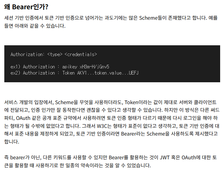 Bearer타입에는 JWT, OAuth가 존재함. ex)' Bearer 토큰으로 JWT를 사용합니다' 라고 표현함