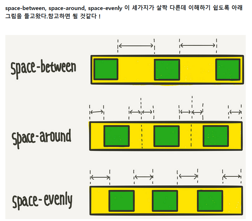 2. justify-content: 콘텐츠 항목 사이와 주위에 가로 공간을 분배하는 방법을 정의한다. 가로 축을 기준으로 좌우에 대한 정렬과 연관됨.