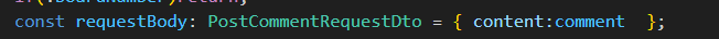 프론트측의 상태 변수 이름은 content였다. 그리고 DTO객체에서 사용되는 변수의 이름은 comment였다. 그래서 아래 코드의 의미는 프론트 측에 상태로 있는 content상태를 comment라는 자료형으로 사용하겠다는 의미이다.
